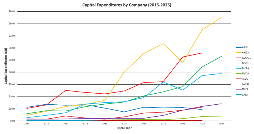 In the decade spanning 2015 to 2025, the world's largest technology companies embarked on what may be the most significant infrastructure buildout in corporate history. Driven by the explosive rise of artificial intelligence and the race to dominate the next computing paradigm, these firms have collectively increased their capital expenditures from $77 billion to over $280 billion annually—a staggering 264% increase that dwarfs even the mobile and cloud computing transitions of the previous decade.