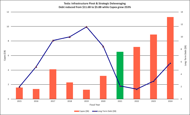 Interestingly, Tesla has dramatically reduced its debt from $11.6 billion in 2019 to just $5.8 billion in 2024. The company has shifted from debt-dependent to cash-flow-funded, reflecting improved profitability and strong free cash flow generation. This deleveraging while simultaneously increasing Capex demonstrates Tesla's improving financial position.