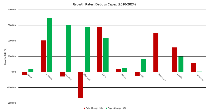 Meta presents an interesting case. The company went from essentially zero debt in 2020 to $29 billion in 2024, using bond markets strategically to fund its massive investments in Llama AI models and Reality Labs (the metaverse division). Despite this increase, Meta's debt-to-Capex ratio remains conservative at 0.77x.